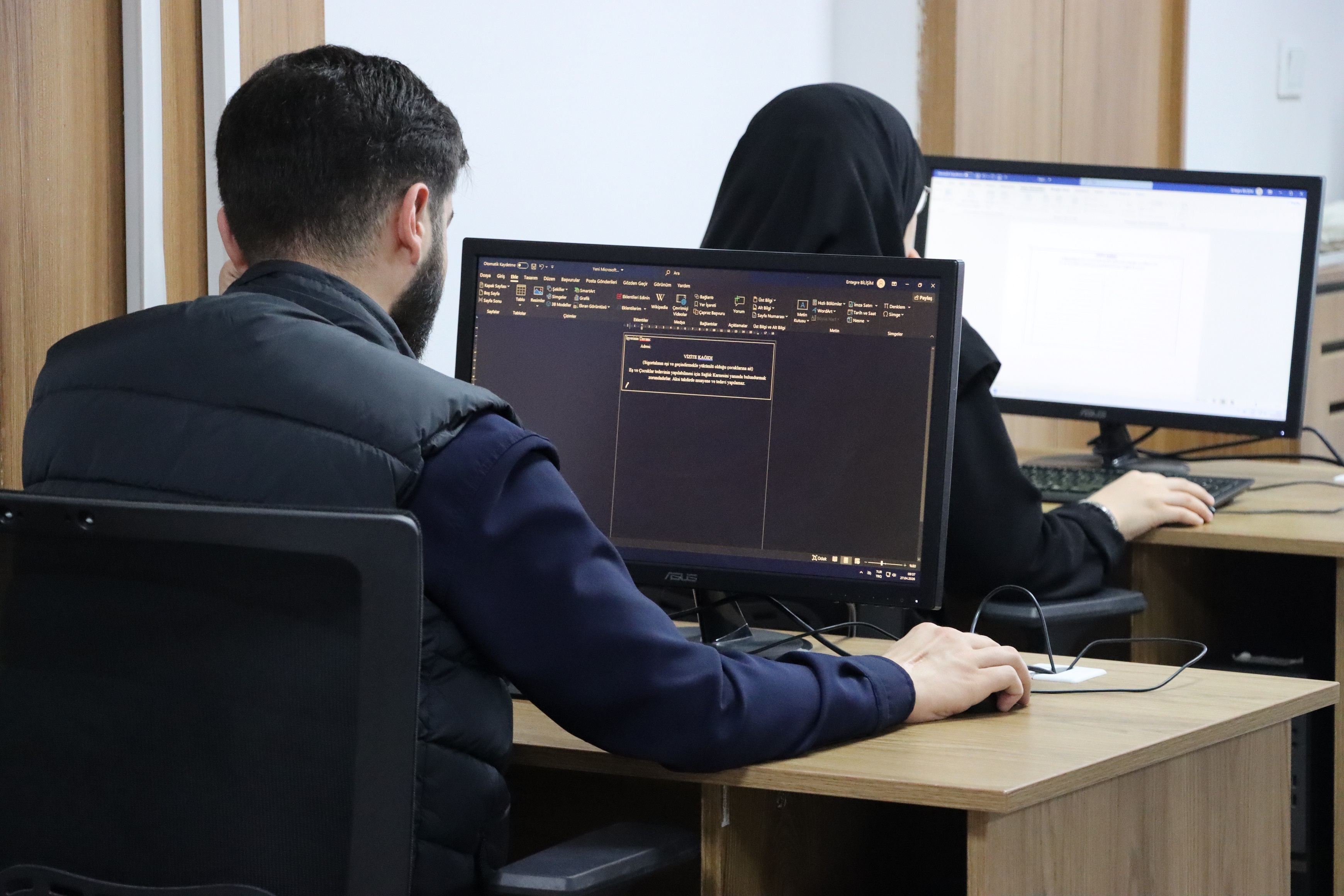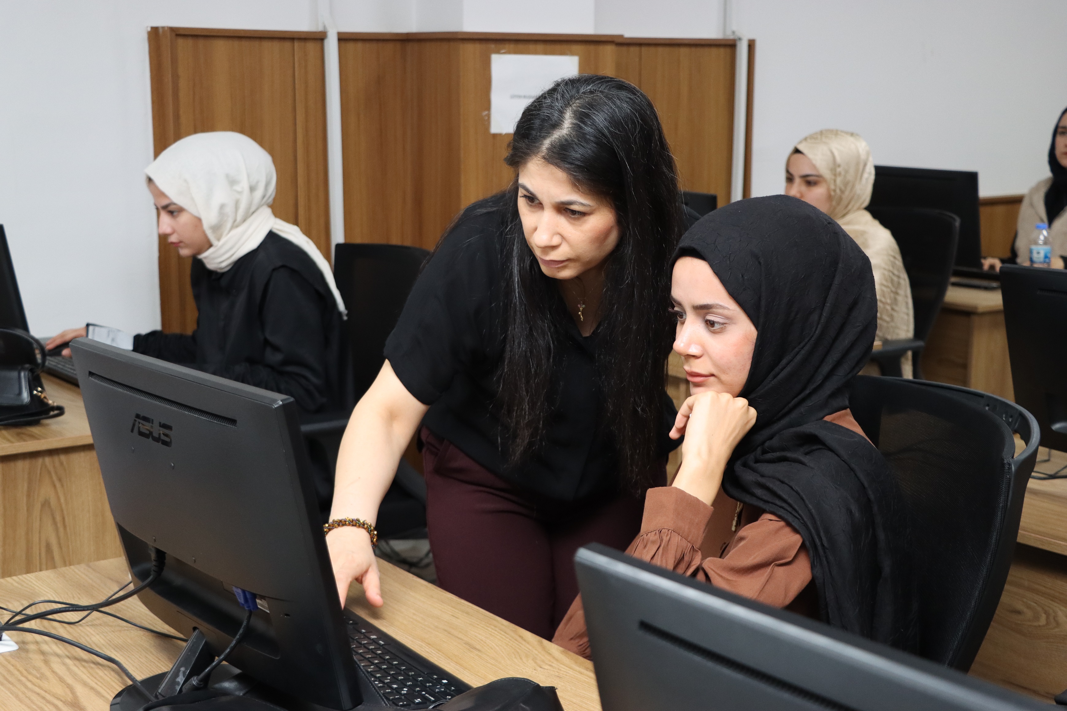 Şanlıurfa Büyükşehir Belediyesi tarafından düzenlenen temel bilgisayar ve ofis programları kurslarında katılımcılar bilgisayar ve ofis programları eğitimini alıyor.
